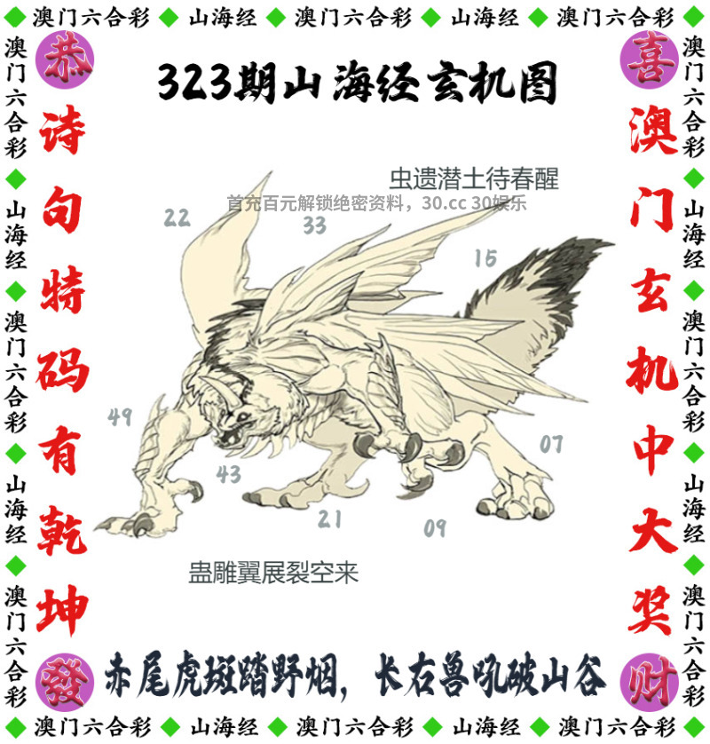 323期:【山海经玄机】开發00 解释:虫遗潜土待春醒,蛊雕翼展裂空来解猪鸡狗 解料:赤尾虎斑踏野烟,长右兽吼破山谷解马羊牛 综合:猪鸡马羊牛狗 主特:07.43.09.21.24.48.11.47.05.41.08.44 |